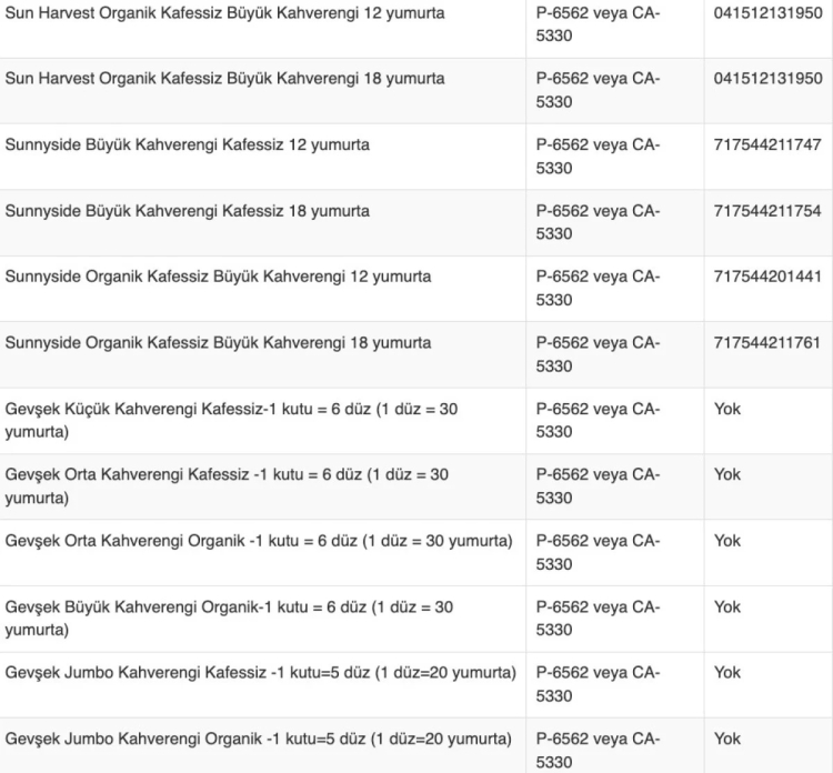 Dikkat edilmesi gereken bu kodlar, karton ambalajın yan kısmında yer alıyor ve hem fiber hem plastik kutularda bulunabiliyor.Yetkililer belirtilen kodlara sahip yumurtaları satın alanların kesinlikle tüketmemeleri, derhal imha etmeleri veya satın alınan mağazaya iade etmeleri konusunda uyarılarda bulunuyor.