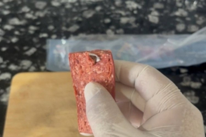 Görüntülerde, sucuğun içindeki yabancı cisim net şekilde görülüyor.