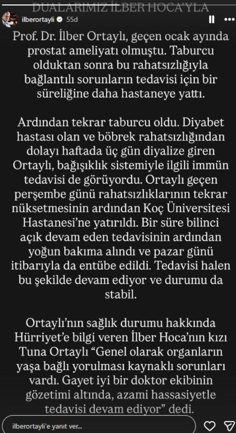 Ortaylı'nın sağlık durumu hakkında Hürriyet'e bilgi veren İlber Hoca'nın kızı Tuna Ortaylı, "Genel olarak organların yaşa bağlı yorulması kaynaklı sorunları vardı. Gayet iyi bir doktor ekibinin gözetimi altında, azami hassasiyetle tedavisi devam ediyor