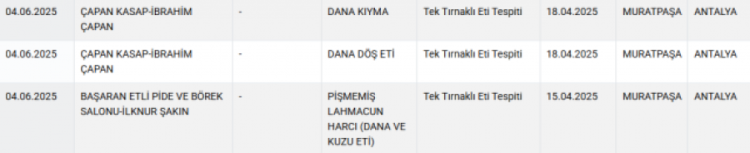'Sağlığı Tehlikeye Düşürecek Gıdalar' listesine göre Antalya'nın Muratpaşa ilçesindeki'Çapan kasap - İbrahim Çapan' adlı firmanın dana kıyma ve dana döş etinde tek tırnaklı eti tespit edildi.