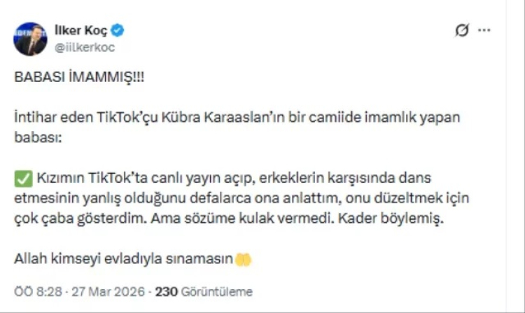 Osmangazi Köprüsü'nden atlayarak intihar eden sosyal medya fenomeni Kübra Karaaslan'ın imam babası kızının intiharının ardından ilk kez konuştu. Osman Şevket Karaarslan çevresine, "Kızımın TikTok'ta canlı yayın açıp, erkeklerin karşısında dans etmesinin yanlış olduğunu defalarca ona anlattım, onu düzeltmek için çok çaba gösterdim. Ama sözüme kulak vermedi. Kader böyleymiş." dediği ifade edildi.