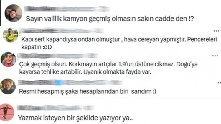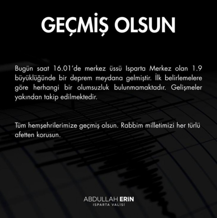 Isparta Valisi Abdullah Erin tarafından deprem sonrası açıklama yaptı. Vali Erin, ilk belirlemelere göre herhangi bir olumsuzluk olmadığı belirterek; "Bugün saat 16.01'de merkez üssü Isparta Merkez olan 1.9 büyüklüğünde bir deprem meydana gelmiştir. İlk belirlemelere göre herhangi bir olumsuzluk bulunmamaktadır. Gelişmeler yakından takip edilmektedir.Tüm hemşerilerimize geçmiş olsun. Rabbim milletimizi her türlü afetten korusun" paylaşımında bulundu. Isparta Valisi Abdullah Erin'in bu paylaşımı sonrası sosyal medya sallandı. Pek çok kullanıcı atılan tweete yorumda bulundu.