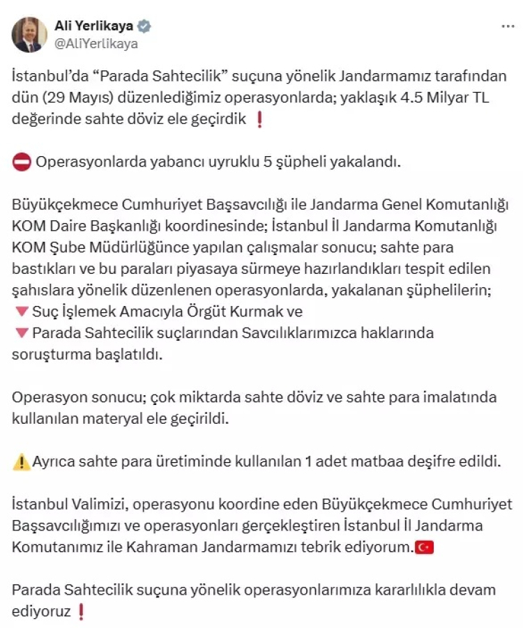 İçişleri Bakanı Ali Yerlikaya, X hesabından yaptığı açıklamada şu ifadeleri kullandı; " İstanbul'da 'Parada Sahtecilik' suçuna yönelik jandarmamız tarafından dün düzenlediğimiz operasyonlarda; yaklaşık 4,5 milyar TL değerinde sahte döviz ele geçirdik. Operasyonlarda yabancı uyruklu 5 şüpheli yakalandı.