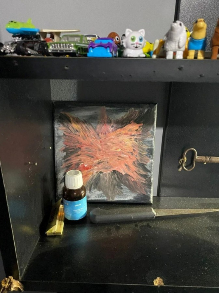 Katilin dolabının üstünde, muhtemelen kendisinin yaptığı bir tablo bulunuyor. Bu tabloda kanatlı bir kadın ellerini açmış olarak duruyor.