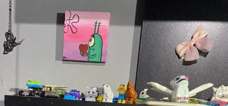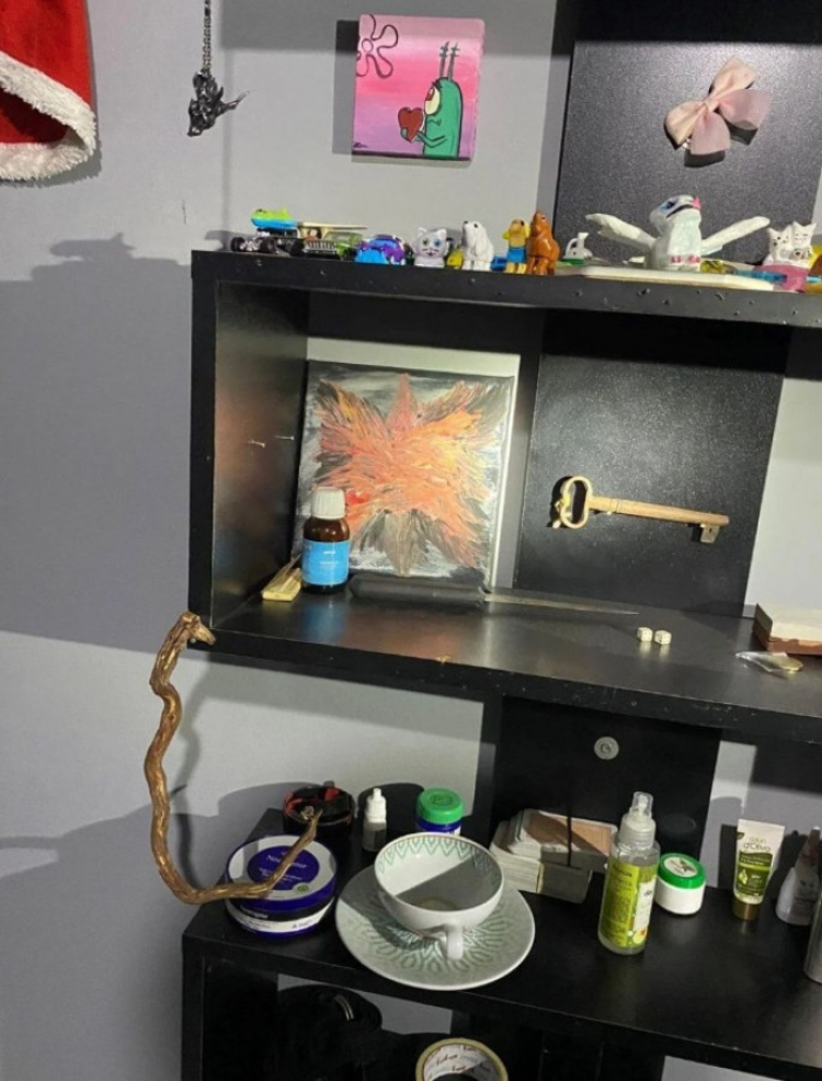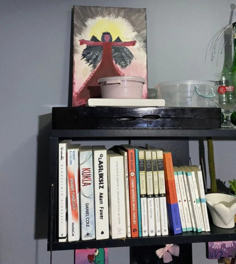 Caninin odasından çekilen fotoğraflarda kitaplığında bir bıçak olduğu görülürken, kanatlarını açmış kadını andırır tablo yer aldı.