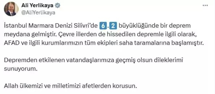 Büyük paniğe neden olan deprem sonrası bir açıklama yapan İçişleri Bakanı Ali Yerlikaya, "İstanbul Marmara Denizi Silivri'de 6.2 büyüklüğünde bir deprem meydana gelmiştir. Çevre illerden de hissedilen depremle ilgili olarak, AFAD ve ilgili kurumlarımızın tüm ekipleri saha taramalarına başlamıştır. Depremden etkilenen vatandaşlarımıza geçmiş olsun dileklerimi sunuyorum. Allah ülkemizi ve milletimizi afetlerden korusun" ifadelerine yer verdi.