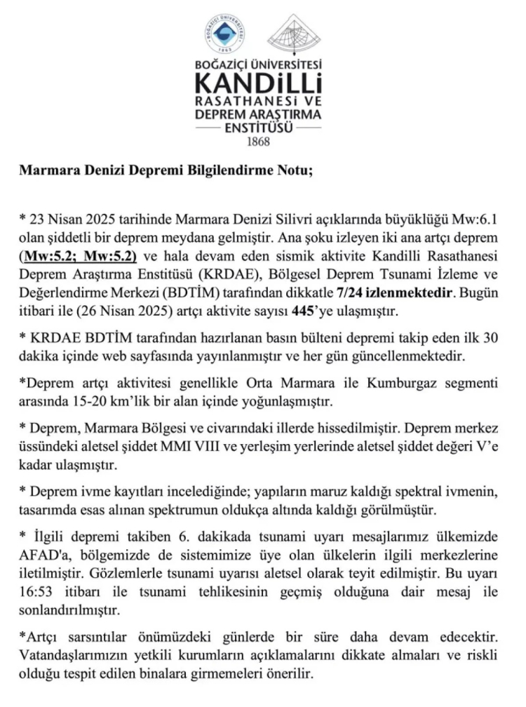 23 Nisan 2025 tarihinde Marmara Denizi Silivri açıklarında büyüklüğü Mw:6.1 olan şiddetli bir deprem meydana gelmiştir. Ana şoku izleyen iki ana artçı deprem (Mw:5.2; Mw:5.2) ve hala devam eden sismik aktivite Kandilli Rasathanesi Deprem Araştırma Enstitüsü (KRDAE), Bölgesel Deprem Tsunami İzleme ve Değerlendirme Merkezi (BDTİM) tarafından dikkatle 7/24 izlenmektedir. Bugün itibari ile (26 Nisan 2025) artçı aktivite sayısı 445’e ulaşmıştır.
