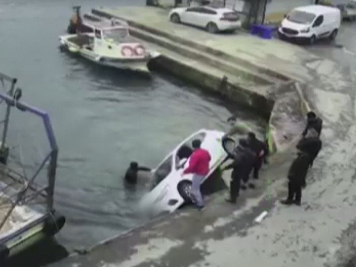Görüntülerde otomobilin balıkçı barınağındaki mendirekten denize düşmesi, teknesinden atlayıp yüzerek olay yerine gelen bir kişi ile çevredeki vatandaşların yardımıyla sürücünün araçtan çıkarılması yer aldı.