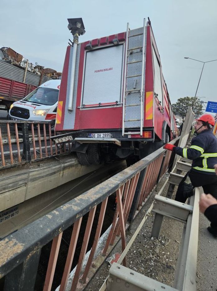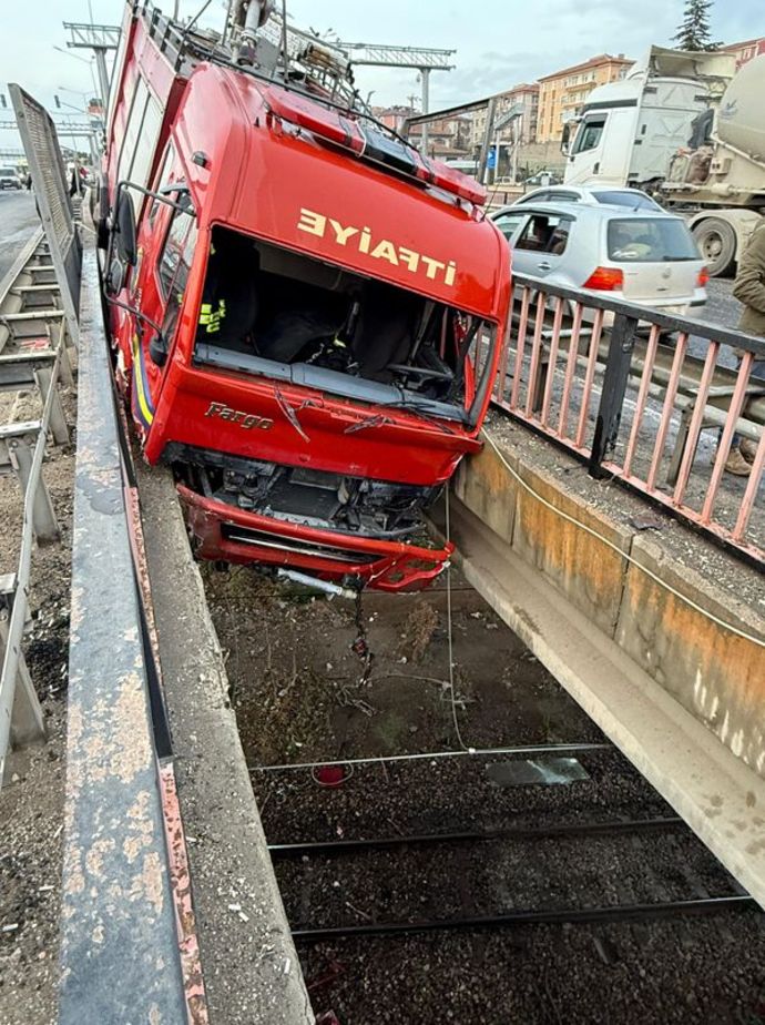 Kırıkkale'de iki köprünün demir korkulukları arasında asılı kalan itfaiye aracındaki 3 görevli yaralandı