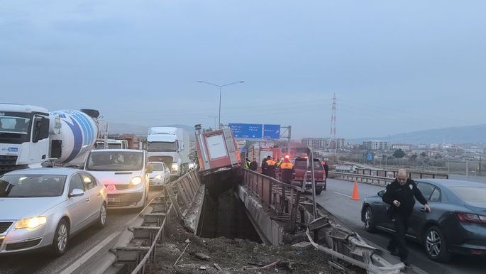 İki köprü arasında asılı kalan itfaiye aracı, vinç yardımıyla bulunduğu yerden kurtarıldı.