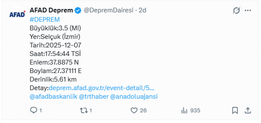 AFAD açıklamasına göre İzmir Selçuk'ta 3.5 büyüklüğünde bir deprem meydana geldi.