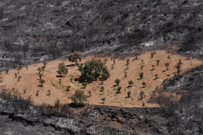 İzmir'in Ödemiş ilçesinde çıkan orman yangınında, küle dönen büyük bir alanın ortasında kalan zeytin ağaçlarının bulunduğu bölgeye alevlerin ulaşmaması ilginç bir görüntü oluşturdu.