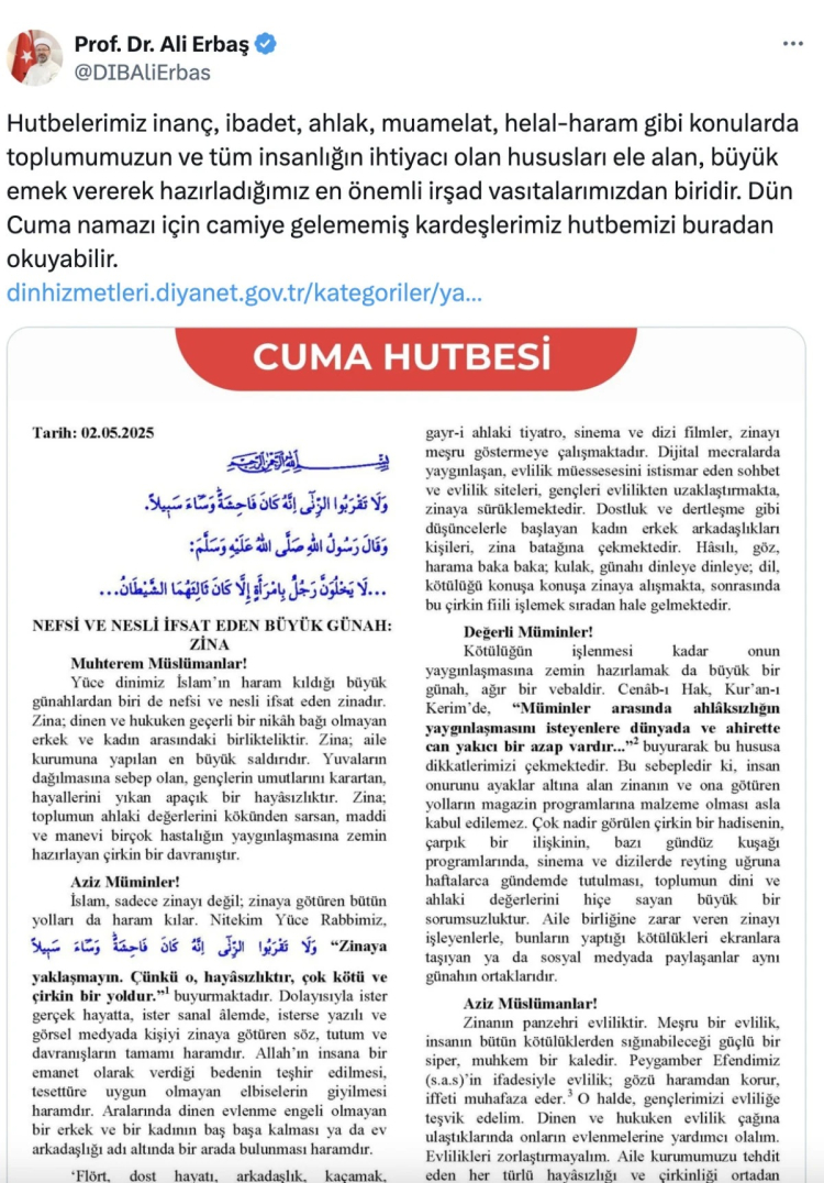 Bu açıklamanın ardından Diyanet İşleri Başkanı Ali Erbaş, X hesabı üzerinden bir paylaşım yaptı ve şöyle dedi: