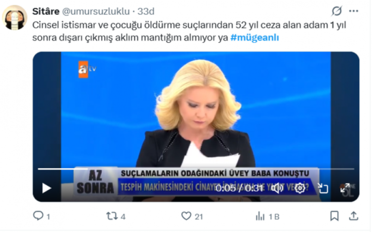 Müge Anlı "Biz işin içinden çıkamadık. Cinsel istismardan 22 yıl, çocuğu kasten öldürmekten 30 yıl ceza alıyor yargıtay bunu onuyor ama dışarıda ama nasıl dışarıda? 52 yıl ceza almış ama nasıl çıkıyor? Çok enteresan bir konu bu" dedi.