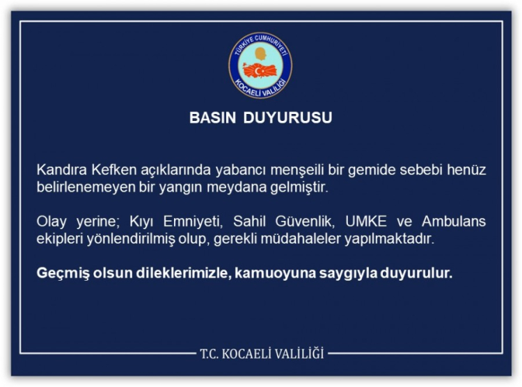 Kocaeli Valiliği de konuyla ilgili yaptığı açıklamada, "Kandıra Kefken açıklarında yabancı menşeili bir gemide sebebi henüz belirlenemeyen bir yangın meydana gelmiştir. Olay yerine; Kıyı Emniyeti, Sahil Güvenlik, UMKE ve ambulans ekipleri yönlendirilmiş olup, gerekli müdahaleler yapılmaktadır. Geçmiş olsun dileklerimizle, kamuoyuna saygıyla duyurulur" ifadeleri yer aldı.