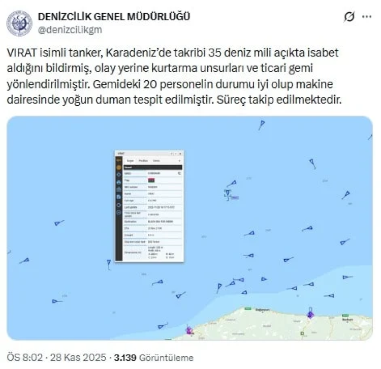 "VIRAT isimli tanker, Karadeniz’de takribi 35 deniz mili açıkta isabet aldığını bildirmiş, olay yerine kurtarma unsurları ve ticari gemi yönlendirilmiştir. Gemideki 20 personelin durumu iyi olup makine dairesinde yoğun duman tespit edilmiştir. Süreç takip edilmektedir."