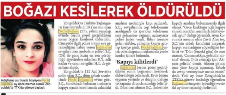 Yapılan ihbarın ardından Zonguldak Emniyet Müdürlüğü'ne bağlı polis ekipleri, genç kızın yaşadığı adrese yönlendirildi. Çağrılan çilingirle kapı açıldı. Eve giren ekipler, odaları tek tek kontrol ederken yatak odasında kan donduran bir manzarayla karşılaştı. Yatağında sırt üstü bulunan genç kız, kafasına poşet geçirilmiş ve boğazı kesilerek öldürülmüştü, Olay yeri güvenlik altına alınırken, Cinayet Masası dedektifleri ve ilgili tüm birimler bölgeye sevk edildi. Hayatını kaybeden genç kız 23 yaşındaki Necla Sağlam’dı.
