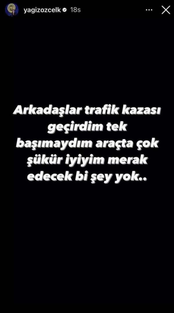 Hastanede tedavi altına alınan Masterchef yarışmacısı Özçelik, sosyal medya hesabından yaptığı paylaşımda, "Arkadaşlar trafik kazası geçirdim. Tek başımaydım araçta. Çok şükür iyiyim" açıklamasında bulundu.