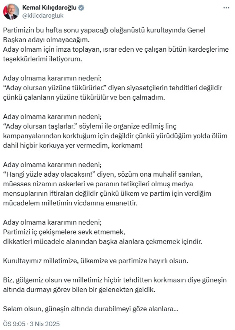 Sosyal medya hesabından açıklama yapan Kılıçdaroğlu, 6 Nisan'da yapılacak olan kurultayda aday olmayacağını söyledi..