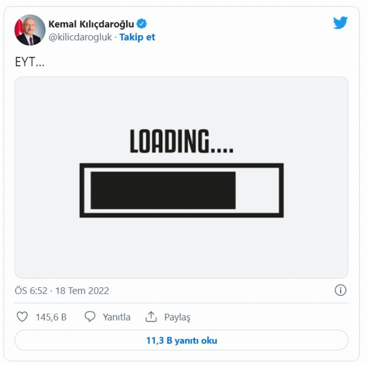 Daha sonra bir paylaşım yapan Kılıçdaroğlu, "EYT" ifadeleriyle birlikte 'loading' yazılı görsel paylaştı. İngilizce "yükleniyor" anlamına gelen loading ifadesiyle Kılıçdaroğlu, sıradaki hedeflerinin Emeklilikte Yaşa Takılanlar olduğunu ima etmiş oldu.