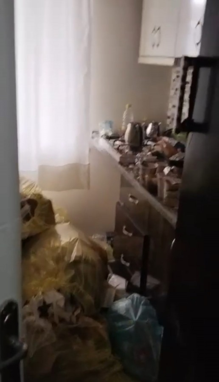 Odaların içinde biriken çöplerin yaşam alanlarını tamamen kapladığı, evin hijyen şartlarının tamamen ortadan kalktığı dikkat çekti.