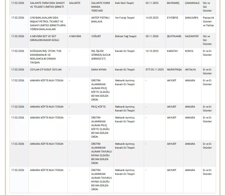 Tarım ve Orman Bakanlığı'nın 17 Şubat 2026 tarihli kamuoyu duyuru listesinde gıda güvenliğini ilgilendiren dikkat çekici uygunsuzluklar ortaya çıktı. Yayınlanan denetim sonuçlarına göre birçok et ürünü, sucuk, köfte, kıyma, baklava, yoğurt ve zeytinyağında taklit, tağşiş ve mevzuata aykırı içerik tespit edildi.