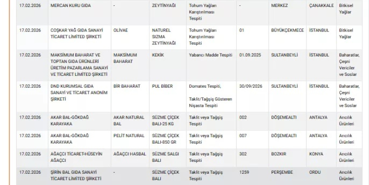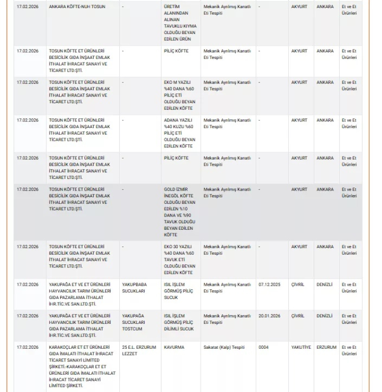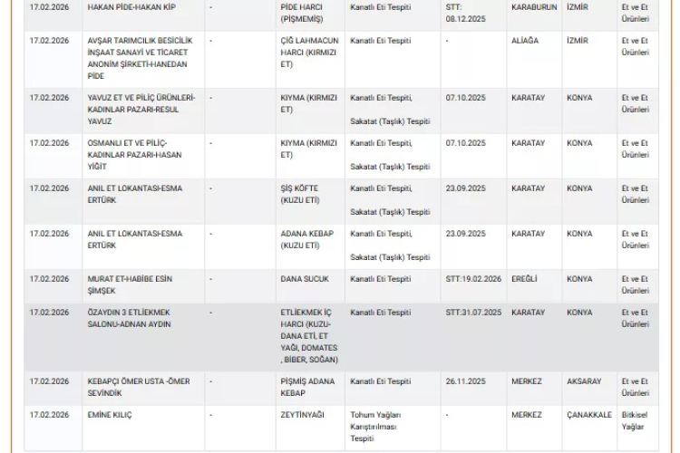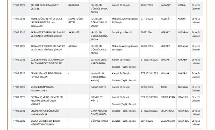 Tarım ve Orman Bakanlığı'nın 17 Şubat 2026 tarihli denetim sonuçları, birçok ilde faaliyet gösteren işletmelerde gıda güvenliği ihlallerini ortaya koydu. Özellikle et ve et ürünleri ile baharat grubunda yapılan kontrollerde, mevzuata aykırı içerik ve et türü tespitleri dikkat çekti.