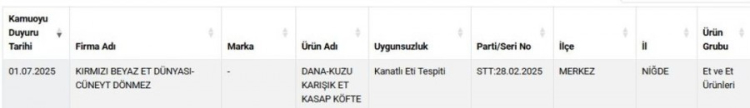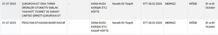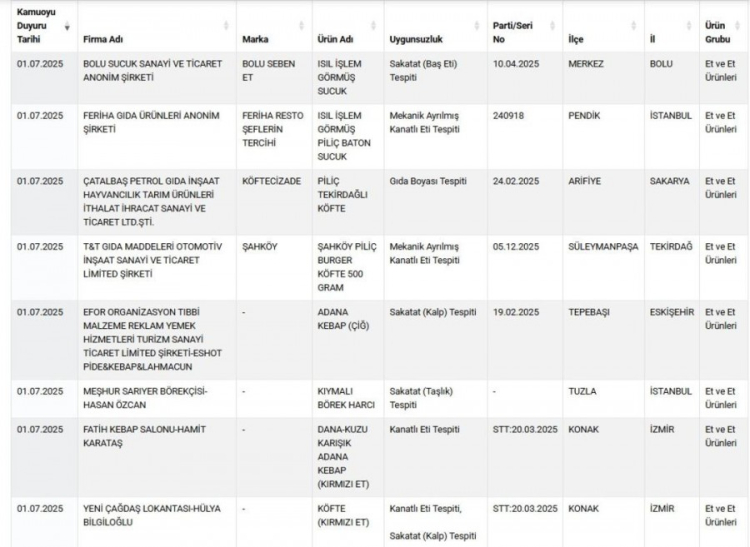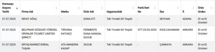 Bakanlık tarafından yayınlanan "Sağlığı Tehlikeye Düşürecek Gıdalar" listesinde dana eti, fermente dana kangal sucuk ve sucuk ürünü yer aldı. Her üç üründe de tek tırnaklı eti tespit edildi.