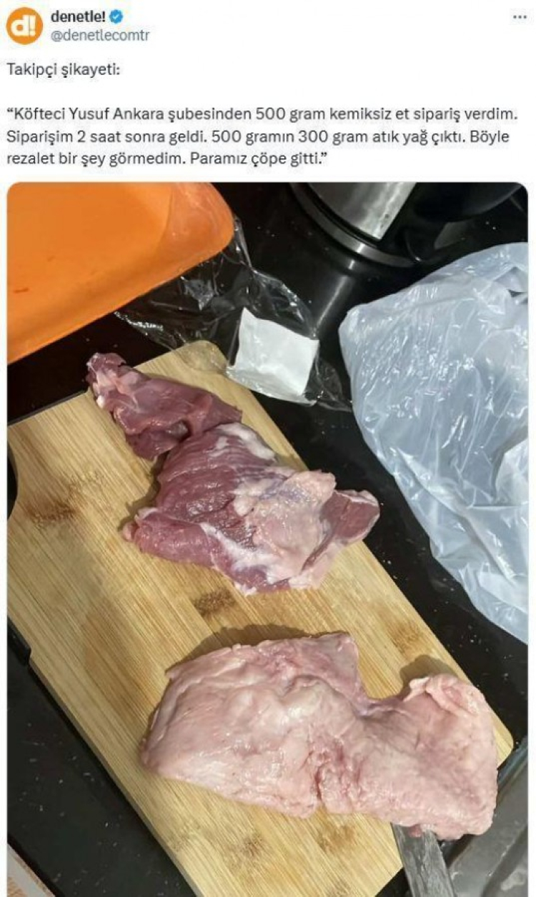 Köfteci Yusuf'un Ankara şubesinden 500 gram kemiksiz et sipariş eden bir vatandaş, etin büyük bölümünün yağ çıktığını belirterek "500 gramın 300 gramı atık yağdı, paramız çöpe gitti" sözleriyle duruma tepki gösterdi.