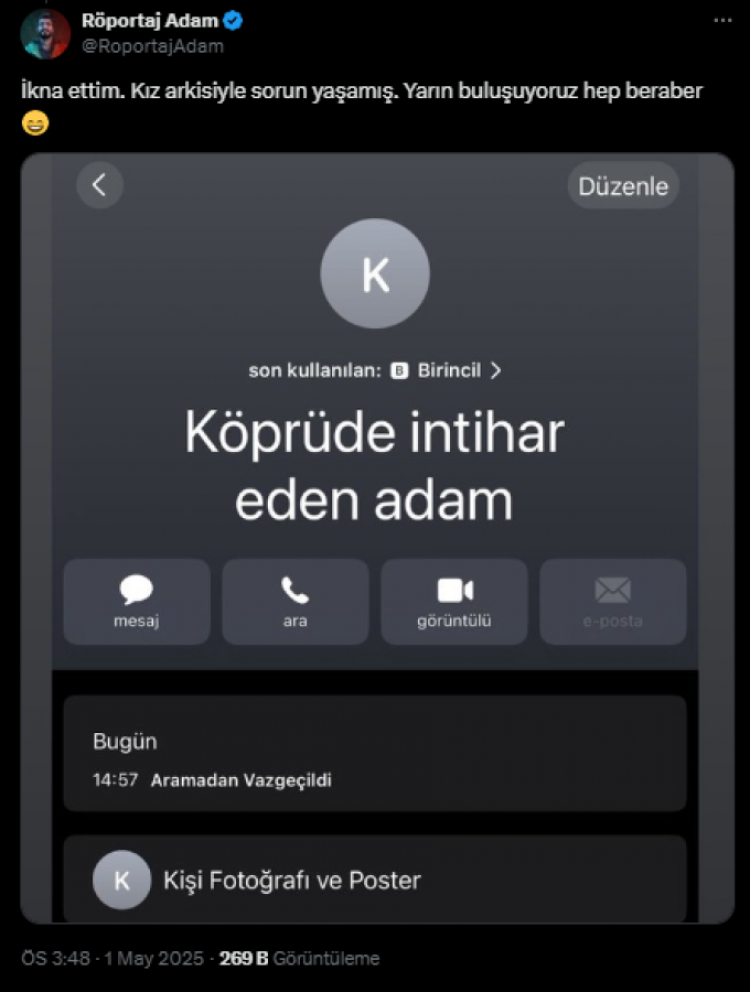 Sevindiren gelişmeyi Karaca sosyal medyadan bizzat duyurdu. Şahsı "Köprüde intihar eden adam" diyerek kaydettiği ekran görüntüsünü paylaşan Karaca, "İkna ettim. Kız arkisiyle sorun yaşamış. Yarın buluşuyoruz hep beraber." dedi.