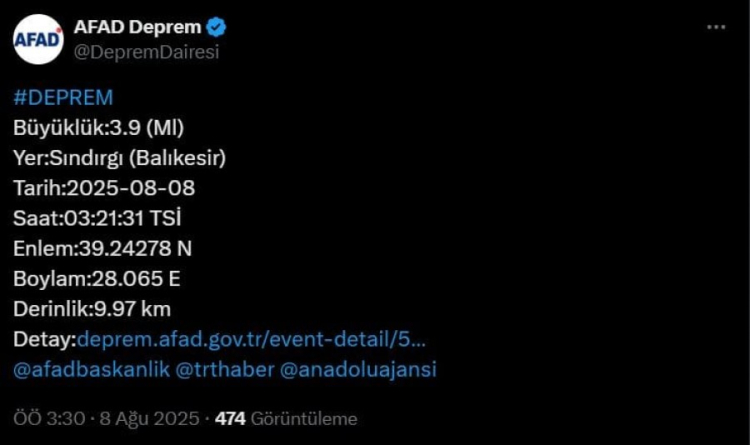"Büyüklük:3.9 (Ml) Yer:Sındırgı (Balıkesir) Tarih:2025-08-08 Saat:03:21:31 TSİ Enlem:39.24278 N Boylam:28.065 E Derinlik:9.97 km"