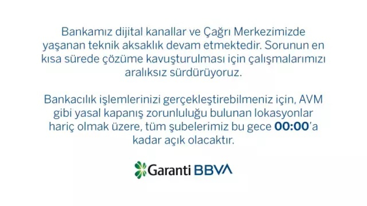 Garanti Bankası dijital kanallar ve çağrı merkezlerine erişimde yaşanan sorunun teknik bir aksaklıktan kaynaklandığını ve herhangi bir siber saldırının olmadığını açıklarken, "Sorunun en kısa sürede tamamen çözüme kavuşması için ilgili birimlerimiz yoğun şekilde çalışmaktadır" denildi.