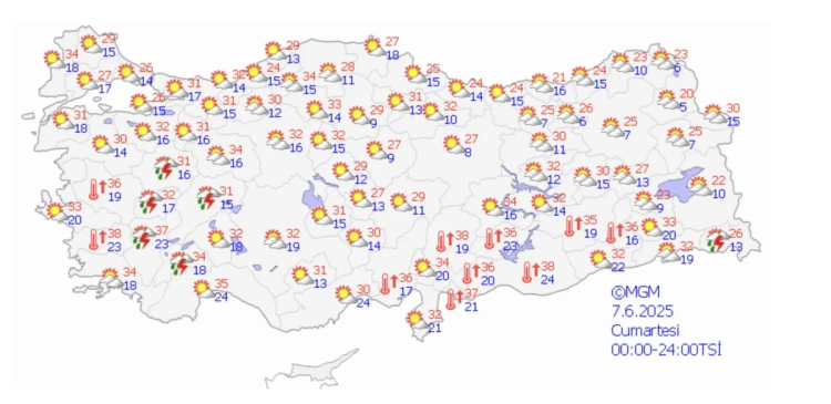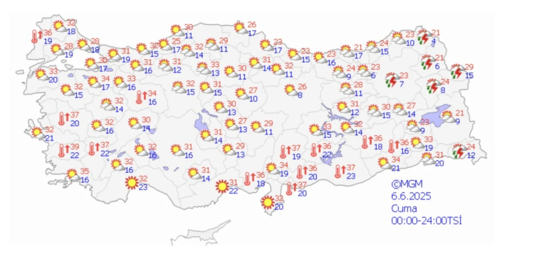 Batı bölgelerde yağış beklenmiyor, hava açık ve güneşli olacak. Ancak Doğu Anadolu’nun doğusunda yerel yağışlar görülebilir.Gece sıcaklıkları iç kesimlerde ve özellikle Doğu Anadolu ile Karadeniz’in iç bölgelerinde hâlâ düşük seviyelerde seyrediyor. Bu bölgelerde gece sıcaklıkları 8 ila 12 derece arasında değişiyor.Öte yandan Marmara, Ege kıyıları ve Akdeniz bölgeleri yaz sıcaklıklarını hissetmeye başlamış olacak. Bu bölgelerde gece sıcaklıkları 24 dereceye kadar yükseliyor.