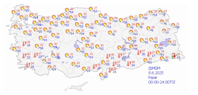Yurt genelinde yağış beklenmiyor. Sadece Doğu Anadolu’da yerel ve kısa süreli yağışlar görülebilir.Güneydoğu Anadolu’da gündüz sıcaklıkları 40 dereceye kadar yükseliyor. Marmara, Ege, İç Anadolu ve Güneydoğu Anadolu bölgelerinde ise sıcaklıklar 30 ila 35 derece arasında olacak.Doğu Karadeniz’de ise diğer bölgelere kıyasla sıcaklıklar belirgin şekilde artmıyor; bu bölgede hava görece daha serin kalmaya devam edecek.