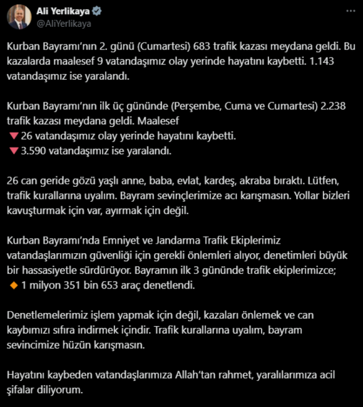 Bakan Yerlikaya, "26 can geride gözü yaşlı anne, baba, evlat, kardeş, akraba bıraktı. Lütfen, trafik kurallarına uyalım. Bayram sevinçlerimize acı karışmasın. Yollar bizleri kavuşturmak için var, ayırmak için değil" sözleriyle vatandaşlara uyarıda bulundu.