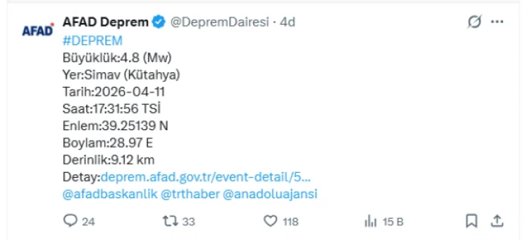 Deprem saat 17.31’de meydana geldi. Kandilli Rasathanesi depremin büyüklüğünü 4,9 olarak açıklarken, AFAD ise 4,8 olarak duyurdu.