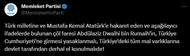 Partiden yapılan açıklamada, "Türk milletine ve Mustafa Kemal Atatürk'e hakaret eden ve aşağılayıcı ifadelerde bulunan çöl faresi Abdülaziz Dwaihi bin Rumaih'in, Türkiye Cumhuriyeti'ne girmesi yasaklanmalı, Türkiye'deki tüm mal varlıklarına devlet tarafından derhal el konulmalıdır!" ifadelerine yer verildi.