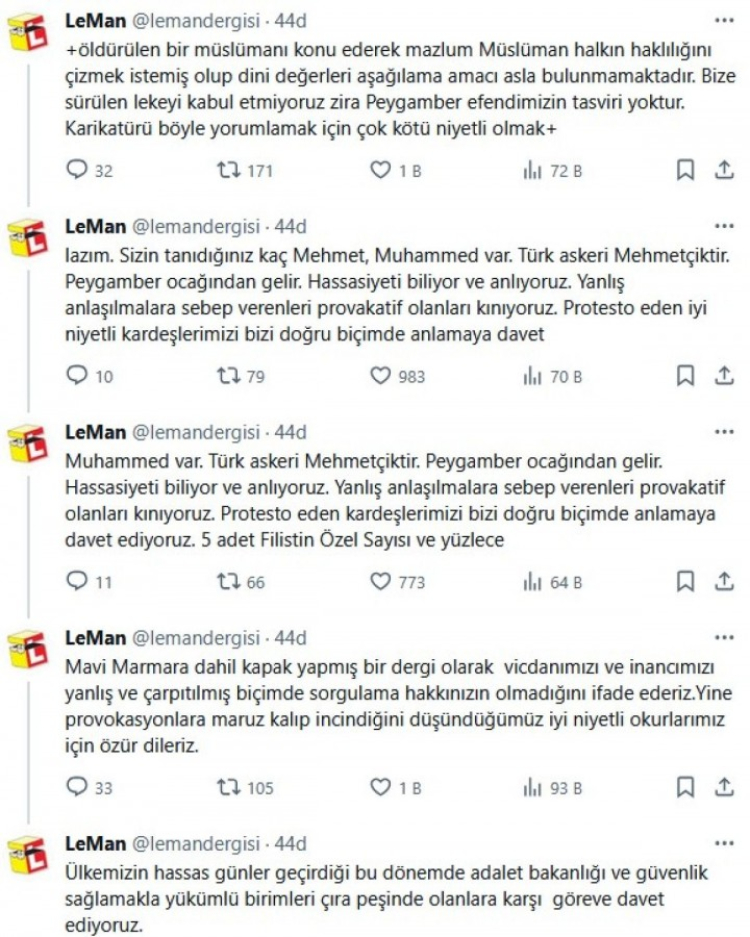 Leman dergisi, Hazreti Muhammed ve Hazreti Musa'yı bombalanan şehirlerin üzerinde çizdi. Vatandaşlar konuyu sosyal medyada paylaşıp tepki gösterdi. İstanbul Cumhuriyet Başsavcılığı konuya ilişkin re'sen başlattığı soruşturma kapsamında çizim sahibi, 2 genel yayın yönetmeni ve sorumlu yazı işleri müdürü olmak üzere 4 kişi hakkında gözaltı kararı verdi. Adalet Bakanı Yılmaz Tunç, konuya ilişkin sosyal medya hesabından yaptığı açıklamada, "İnançlarımıza yönelik saygısızlık asla kabul edilemez. Bir mizah dergisi tarafından Peygamber Efendimizin karikatürünün çizilmesiyle ilgili İstanbul Cumhuriyet Başsavcılığı tarafından Türk Ceza Kanununun 216. maddesi gereğince 'dini değerleri alenen aşağılama' suçundan adli soruşturma başlatılmıştır. Hiçbir özgürlük, bir inancın kutsallarını çirkin bir şekilde mizah konusu yapma hakkı tanımaz. Peygamber Efendimizin karikatürize edilmesi ya da herhangi bir şekilde görsel olarak temsil edilmeye çalışılması; sadece dini değerlerimize değil, aynı zamanda toplumsal barışa zarar vermektedir. Milyonlarca Müslümanın inançlarını hiçe sayan bu provokasyon girişimine karşı gerekli hukuki adımlar gecikmeksizin atılacaktır" ifadelerine yer verdi.