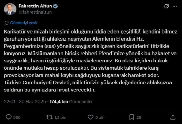 Cumhurbaşkanlığı İletişim Başkanı Fahrettin Altun, "Karikatür ve mizah dergisi olduğunu iddia eden birtakım kendini bilmez güruhun yönettiği ahlaksız neşriyatın, Alemlerin Efendisi Hazreti Peygamberimize yönelik saygısızlık içeren karikatürlerini şiddetle kınıyoruz. Türkiye Cumhuriyeti Devleti, milletimizin yüksek değerlerine ahlaksızca saldıran bu aymazlara fırsat vermeyecektir" dedi Cumhurbaşkanlığı İletişim Başkanı Fahrettin Altun, Hazreti Muhammed'e yönelik yayınlanan saygısız karikatüre sert tepki gösterdi. Altun sosyal medya hesabından yaptığı paylaşımda şu ifadelere yer verdi: "Karikatür ve mizah dergisi olduğunu iddia eden birtakım kendini bilmez güruhun yönettiği ahlaksız neşriyatın Alemlerin Efendisi Hazreti Peygamberimize (s.a.s.) yönelik saygısızlık içeren karikatürlerini şiddetle kınıyoruz. Müslümanların biricik rehberi Efendimize yönelik bu hakaret ve saygısızlık, basın özgürlüğüyle maskelenemez. Bu hastalıklı zihniyetten hukuk önünde mutlaka hesap sorulacaktır. Bu sistematik tahriklere karşı provokasyonlara mahal vermeden sağduyuyu kuşanarak hareket etmeliyiz. Türkiye Cumhuriyeti Devleti, milletimizin yüksek değerlerine ahlaksızca saldıran bu aymazlara fırsat vermeyecektir."