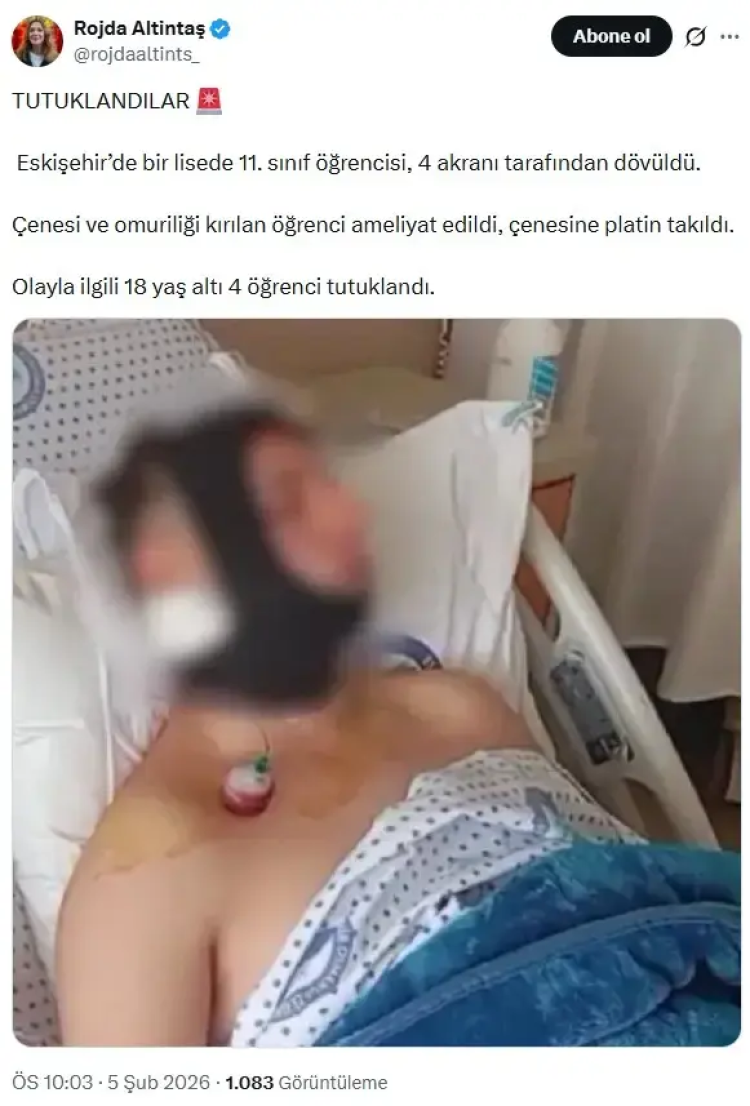 Eskişehir'de bir lisede 11. sınıf öğrencisini 4 akranı dövdü. Aldığı darbelerle çenesi ve omuriliği kırılan öğrenci acil ameliyata alınırken, çenesine platin takıldı. Olaya ilişkin gözaltına alınan 18 yaşından küçük 4 kişi tutuklandı.