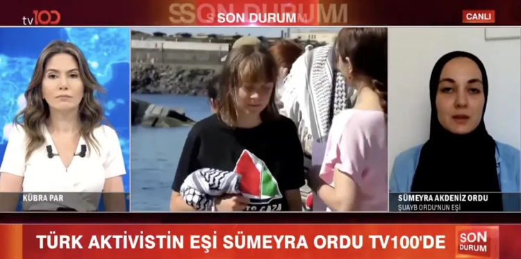 İsrail'in uluslararası sularda müdahale edip alıkoyduğu Madleen isimli yelkenlide bulunan Türk aktivist Şuayb Ordu’nun eşi tv100'de Kübra Par'la Ana Haber'de önemli açıklamalarda bulundu.