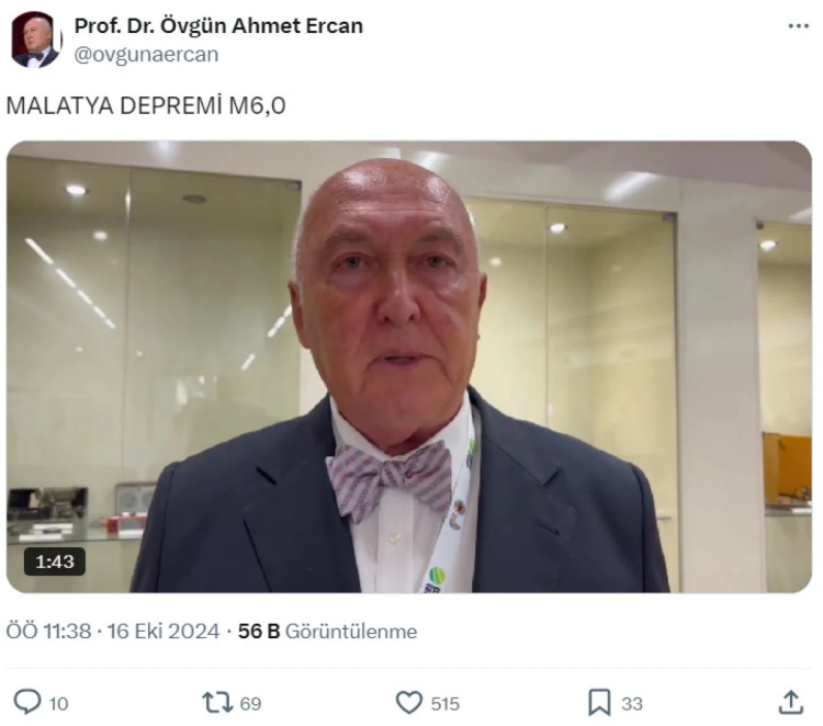 Sosyal medya hesabından yaptığı açıklamalar ile korkutan Ercan depreme ilişkin yaptığı açıklamalarında, "Bugün Malatya'da 6 büyüklüğünde bir deprem oldu. Bu deprem 2023 yılında olan iki tane büyük depremin artçısıdır. 2023'teki boşalma yaklaşık 4 tane kırıkta olmuştu.