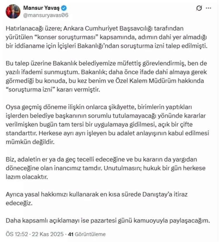 Ankara Büyükşehir Belediye Başkanı Mansur Yavaş, İçişleri Bakanlığı'nın soruşturma izni kararına ilişkin sosyal medya hesabından açıklama yaptı. Yavaş, "Hatırlanacağı üzere; Ankara Cumhuriyet Başsavcılığı tarafından yürütülen konser soruşturması kapsamında, adımın dahi yer almadığı bir iddianame için İçişleri Bakanlığı'ndan soruşturma izni talep edilmişti. Bu talep üzerine bakanlık belediyemize müfettiş görevlendirmiş, ben de yazılı ifademi sunmuştum. Bakanlık; daha önce ifade dahi almaya gerek görmediği bu konuda, bu kez benim ve Özel Kalem Müdürüm hakkında soruşturma izni kararı vermiştir. Oysa geçmiş döneme ilişkin onlarca şikayette, birimlerin yaptıkları işlerden belediye başkanının sorumlu tutulamayacağı yönünde kararlar verilmişken, bugün tam tersi bir uygulamaya gidilmesi, açık bir çifte standarttır. Herkese ayrı ayrı işleyen bu adalet anlayışının kabul edilmesi mümkün değildir. Adaletin er ya da geç tecelli edeceğine ve bu kararın da yargıdan döneceğine olan inancımız tamdır. Unutulmasın; hukuk bir gün herkese lazım olacaktır. Ayrıca yasal hakkımızı kullanarak en kısa sürede Danıştay'a itiraz edeceğiz. Daha kapsamlı açıklamayı ise pazartesi günü kamuoyuyla paylaşacağım" dedi.