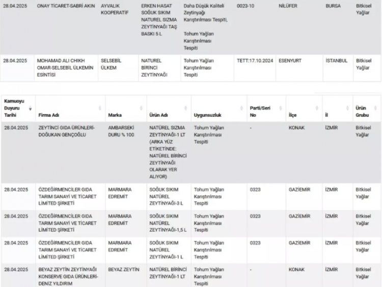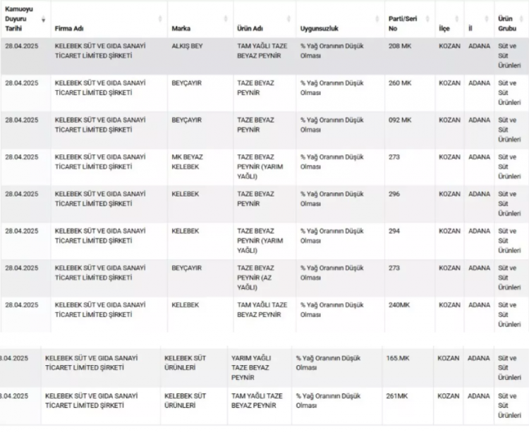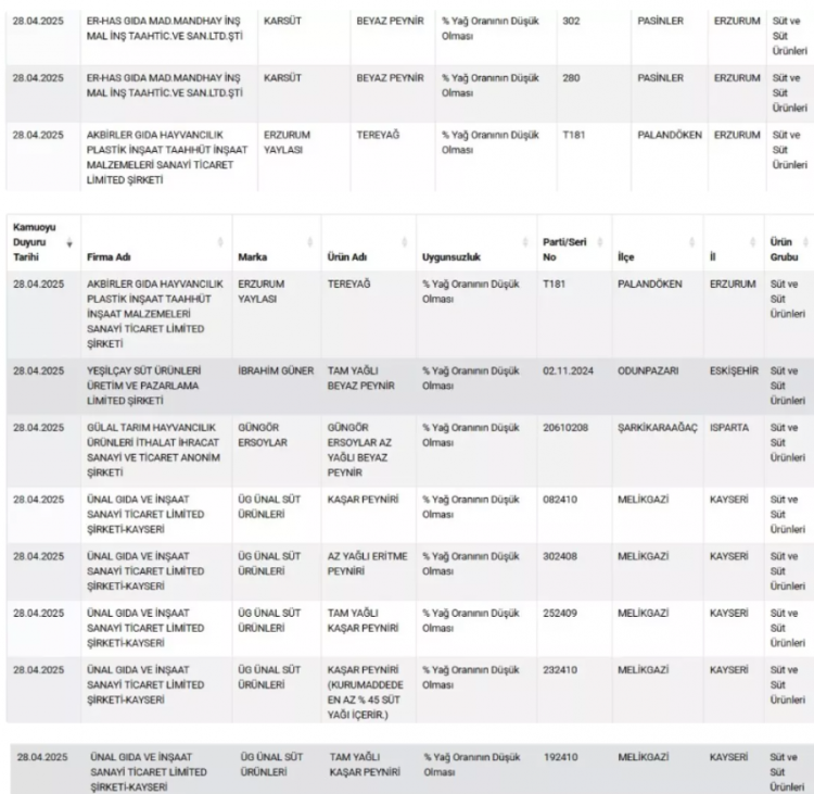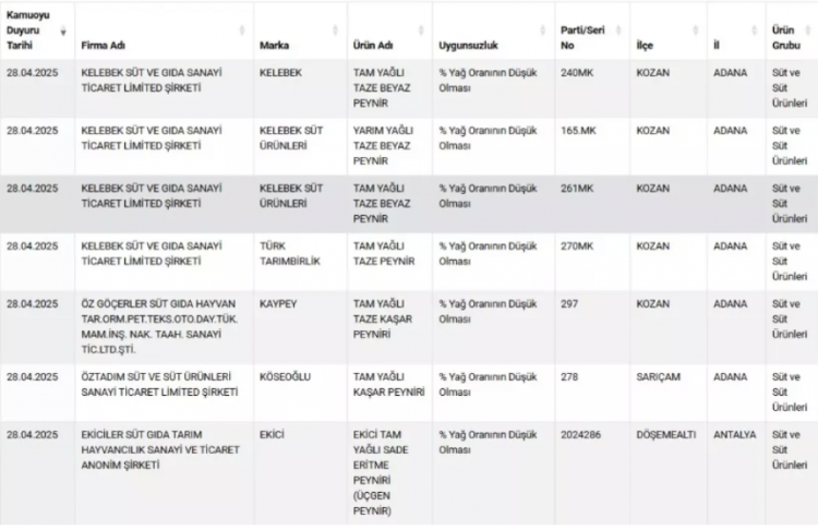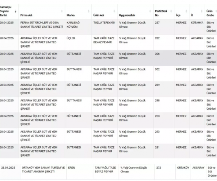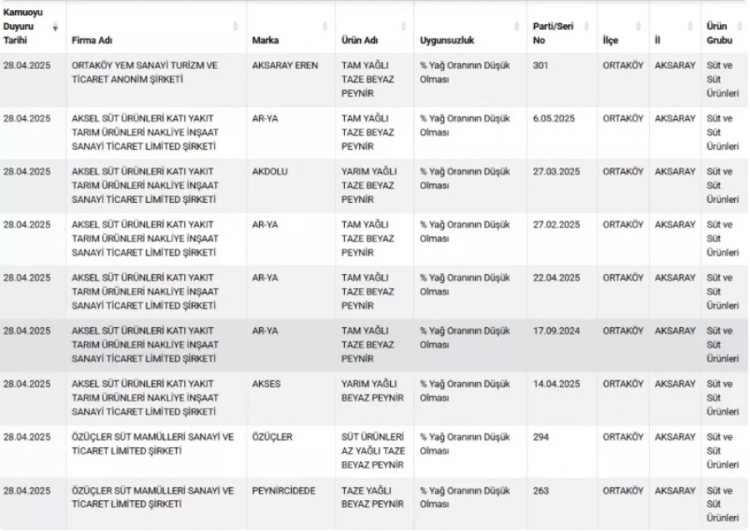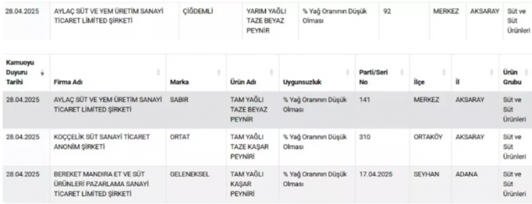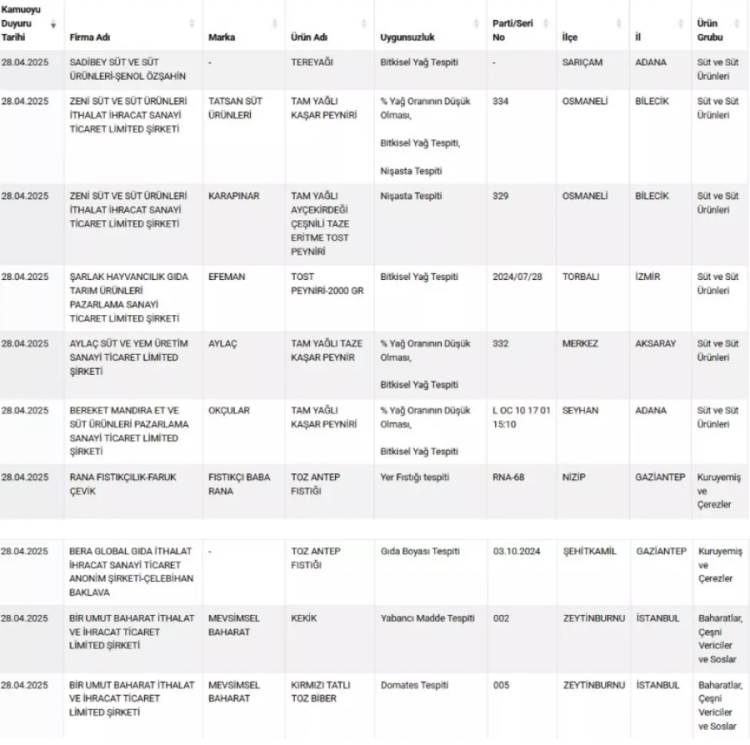 Firma adı ve markalarıyla duyurulan ürünlerde, tespit edilen uygunsuzluklar tek tek açıklandı. Buna göre; 'tam yağlı kaşar peyniri'nde % yağ oranının düşük olması, bitkisel yağ tespiti ve nişasta tespiti gibi uygunsuzluklar belirlenirken toz antep fıstığında da yer fıstığı ve gıda boyası çıktı. Kekikte yabancı madde tespit edilirken kırmızı tatlı toz biberde de domates çıktı.