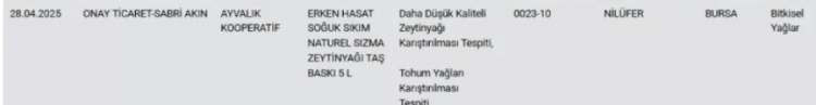 Süzme çiçek balında taklit veya tağşiş tespiti yapılırken zeytinyağında tohum yağları karıştırıldığı tespit edildi. Tereyağında da bitkisel yağ tespiti yapıldı.
