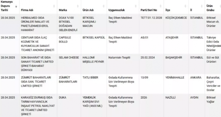 Bakanlığın yayınladığı 28 Nisan tarihli "Sağlığı Tehlikeye Düşürecek Gıdalar" listesinde 5 yeni ürün ve marka yer aldı. Buna göre; bitkisel karışımlı macun ürününde uygunsuzluk olarak 'ilaç etken maddesi tespiti' belirtildi. Bitkisel kapsül ürününde de ilaç etken maddesi tespit edilirken hallomi mişelle peynir ürününde natamisin tespit edildi.