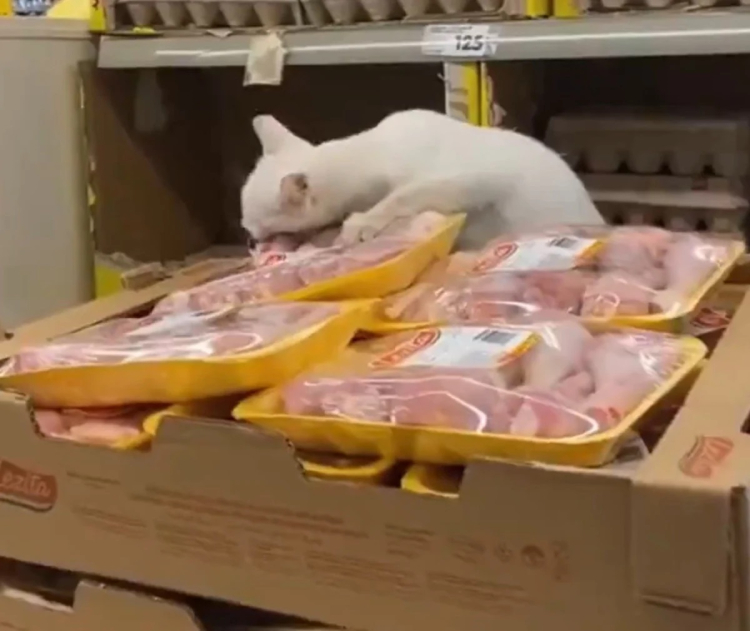 Sosyal medyada paylaşılan bir görüntüde, zincir markette raflara yerleştirilmesi beklenen tavuk paketleri mahallenin kedisinin yemeği oldu.