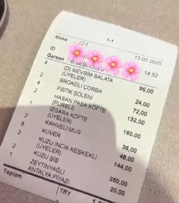 Sözcü'de yer alan habere göre; grupta yer alan bir vatandaş, yedikleri yemeklerin lezzetli olduğunu belirterek, ödedikleri adisyonu paylaştı. Buna göre; hesap 1082 lira gelirken, 8 kişilik garson hizmeti (Kuver) için de kişi başı 6 lira ücret alındı.