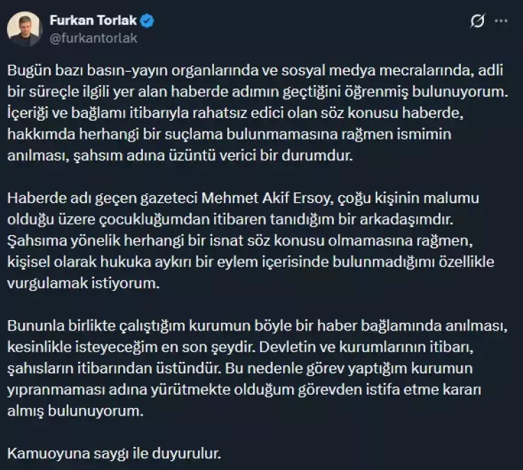 Mehmet Akif Ersoy soruşturması ile ilgili iddialarda adı geçen Furkan Torlak, İletişim Başkanlığı Dezenformasyonla Mücadele Merkezi Koordinatörlüğü görevinden istifa etti.