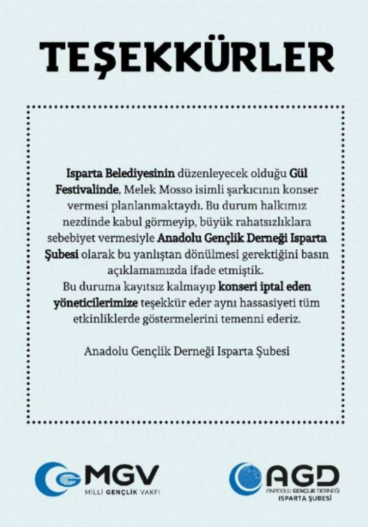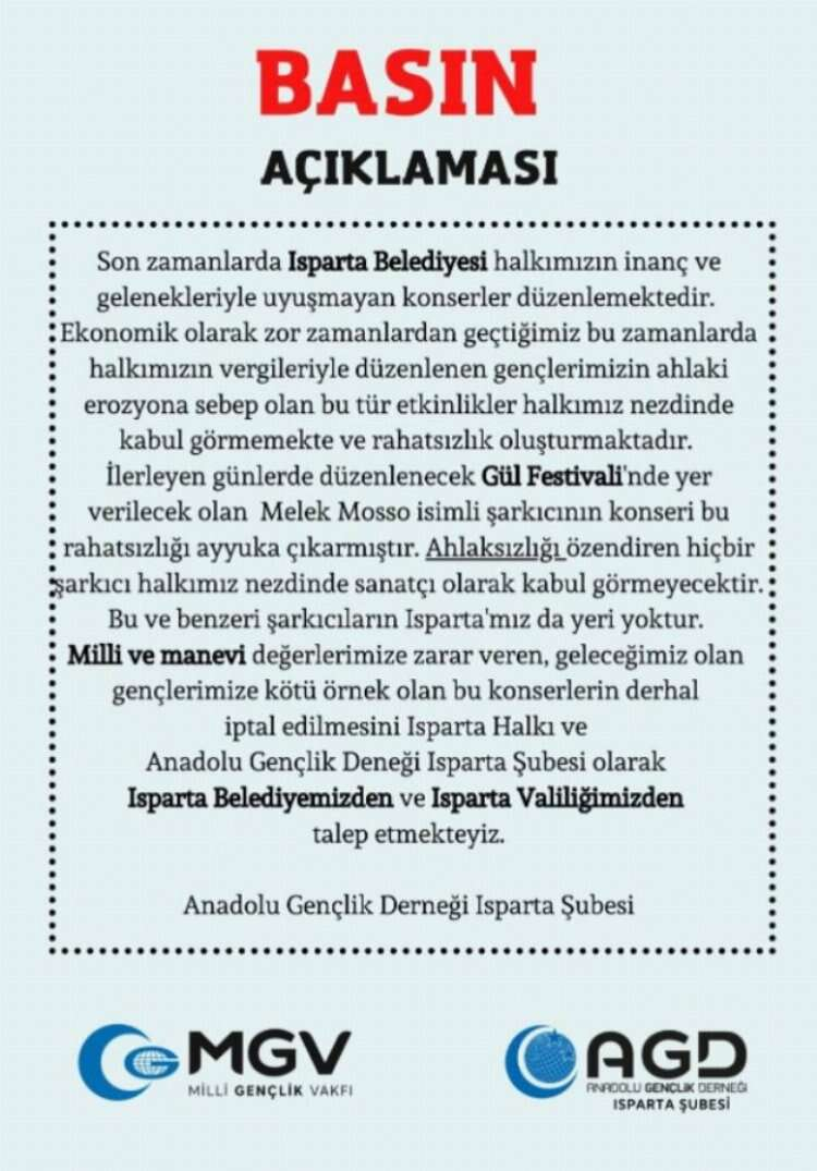 Açıklamada, Melek Mosso konserinin iptal edilmesi talep edilirken, "Ahlaksızlığı özendiren hiçbir şarkıcı halkımız nezdinde sanatçı olarak kabul edilmeyecektir" ifadesine yer verildi.